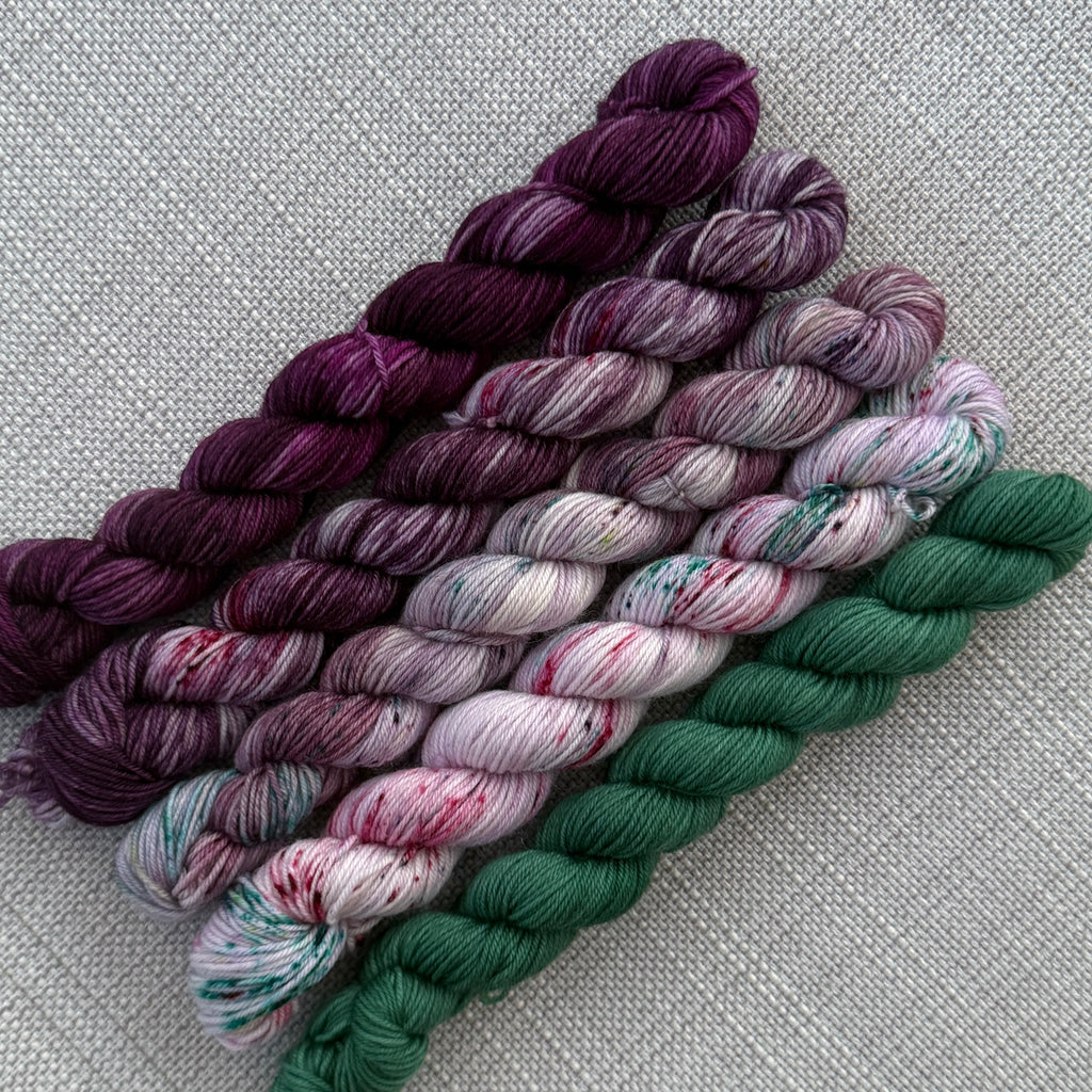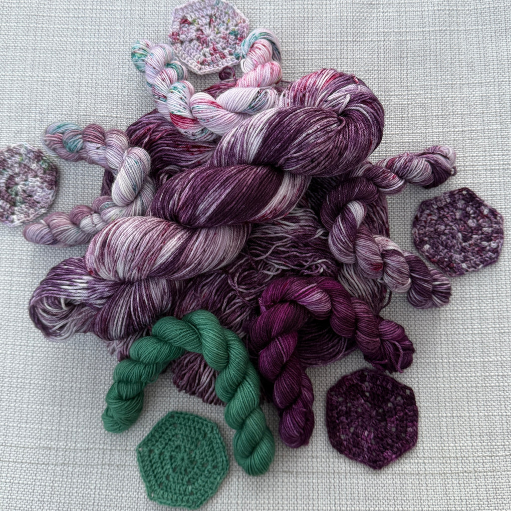 You will receive either 10g, 20g, 50g or 100g of each of the hand dyed yarns. Please note 10g and 50g skeins are only available on Merino and Stellina bases. A 10g mini set would be ideal for adding to a blanket. 20g mini sets would be ideal for socks or a cowl. 50g skein sets would be ideal for a shawl or a t shirt. 100g skein sets would be ideal for shawls or a garment.