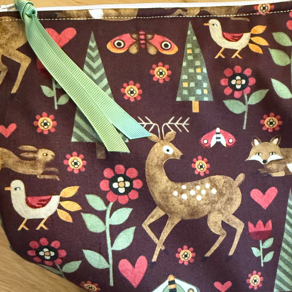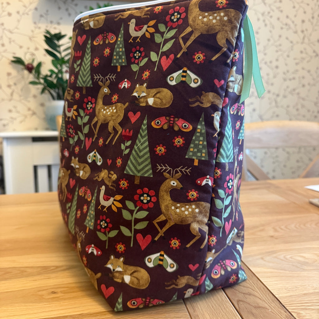 The Autumn print knitting project bag is made from 100% cotton and the bag is padded with lightweight polyester wadding to give the bag stability and squishiness. The bag is closed with a drawstring (or zip as requested) and has a double inner pocket to accommodate notions. The inner pocket also allows the application of pin badges on the outside of the bag so that it doesn’t interfere with your knitting.