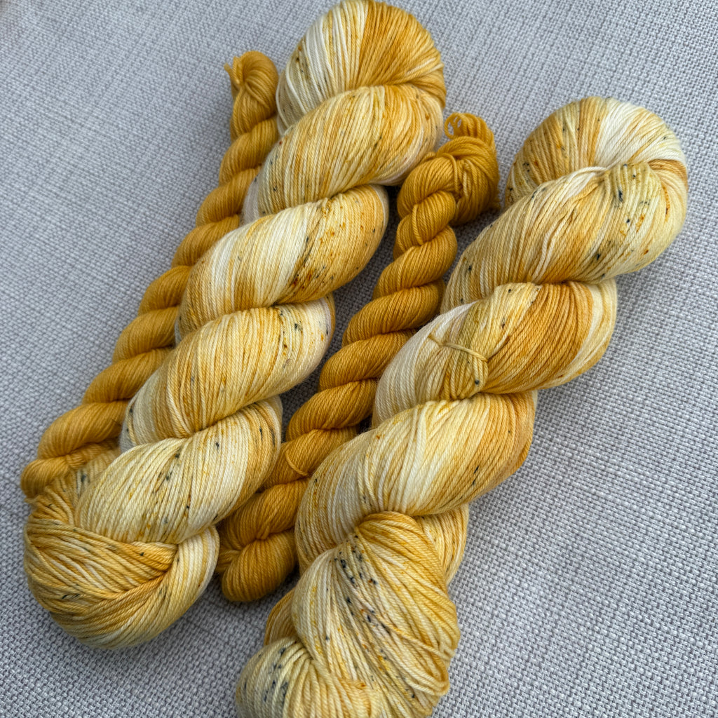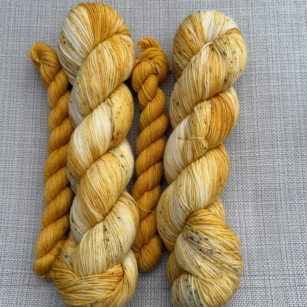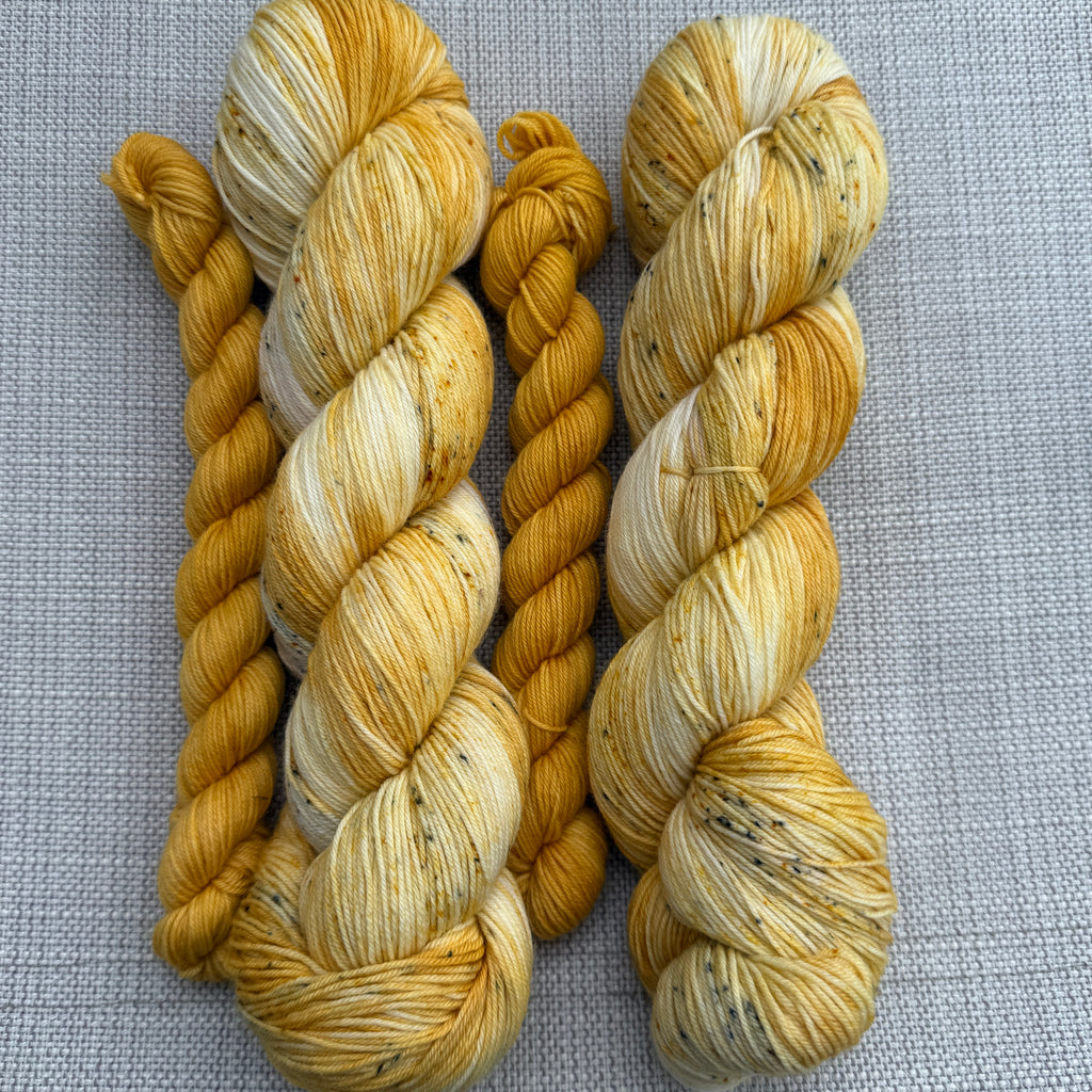 A lovingly handmade yarn inspired by Bee's. Optional coodinating 20g mini of Shiny Happy People (mustard yellow). The 20g mini is enough for contrasting heels and toes of a sock.