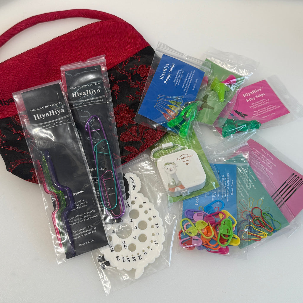 The HiyaHiya Accessory Set offers a selection of best-selling HiyaHiya knitting and crochet accessories and is presented in HiyaHiya's trade-mark Chinese brocade project bag, great for storing needles, accessories and at least one ball of yarn. The project bag has a handy zipper inside to safely stow your small accessories.